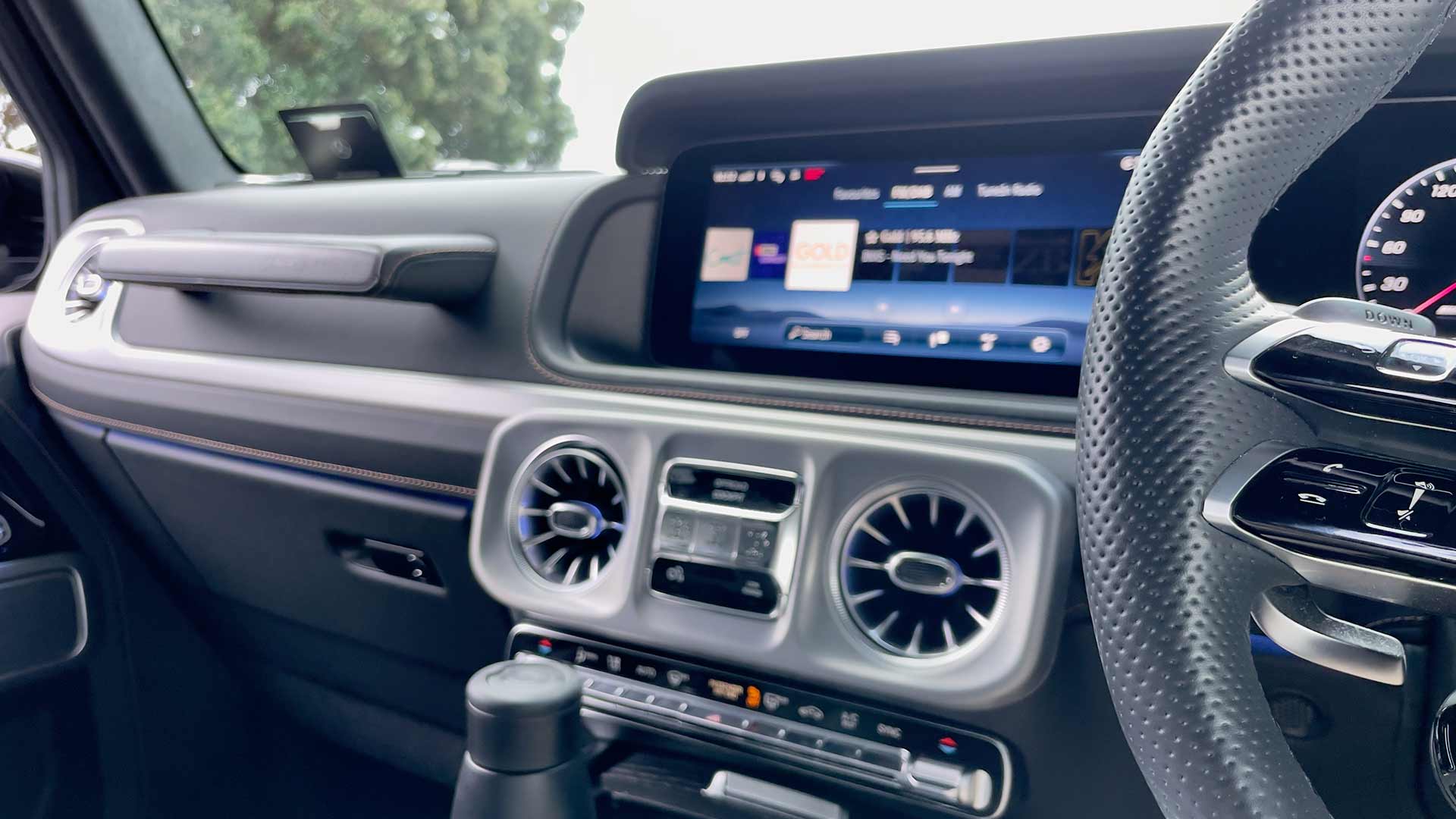 The classic G63 side exit exhausts look and sound fantastic. At idle they sound like a grumpy bear and as you build up through the rev range the sonic symphony reaches 1812 levels of vehicular warfare. No coincidence, the G started as a military vehicle commissioned for the Shah of Iran no less, so practicality and toughness were first on the agenda. Hence flat sides that are easier to manufacture and armor. The square shape makes for massive windows and great visibility. Good for road driving and great for off-roading. It has always been probably the world’s most capable 4×4 with ludicrous approach and departure angles, extreme sideways acrobatics and the ability to gobble up the most treacherous terrain. The centrally placed three diff lock options, plus low range and the nine speed dual clutch transmission with rock hop and crawl modes prove that.