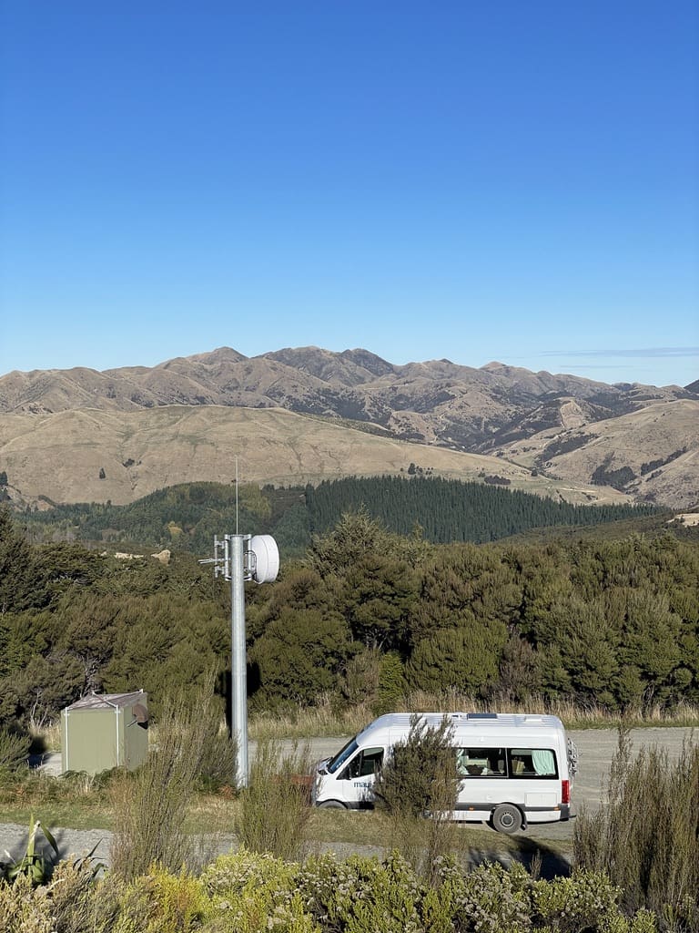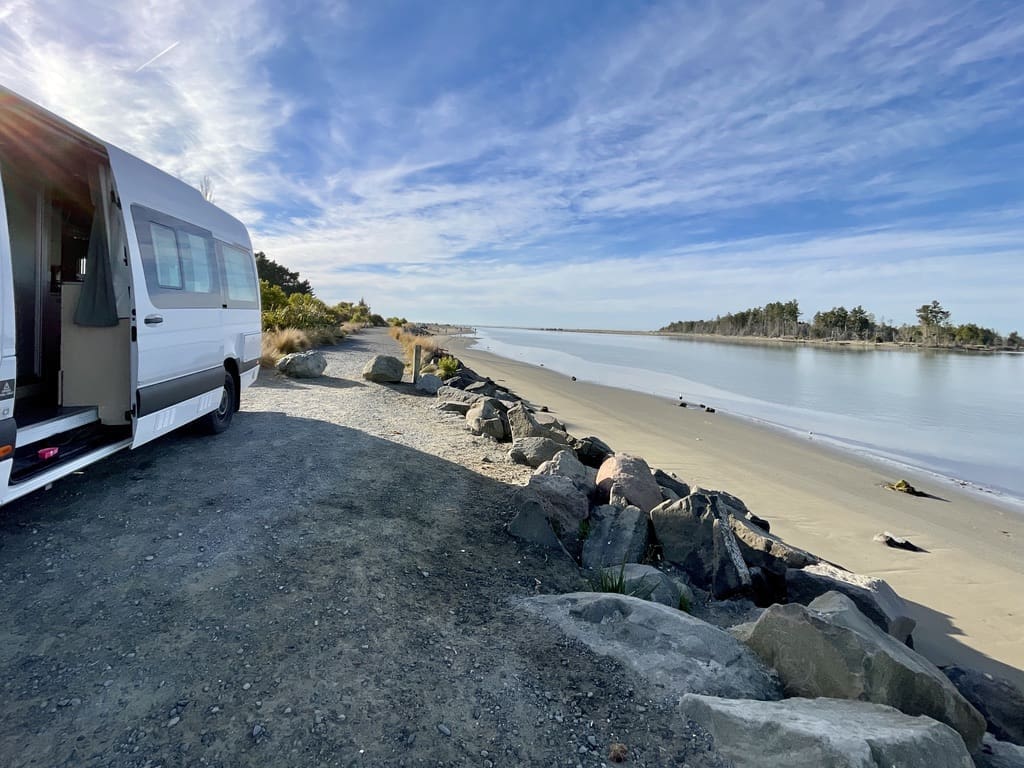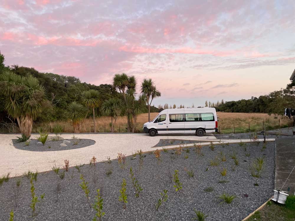 The pick-up point is near Christchurch Airport, that’s easy, so it pickup. I just show the confirmation on the app and minutes later I’m in my fancy Maui camper. Seating for several people converts into a large bed, another converts to a single. It drives like a car with top electronics, navigation, media, and Apple CarPlay. The high seating position and big windows mean you can see twice as much as in a car.