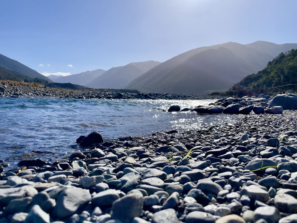 After stretching one hour’s travel into three, I arrive at the next hot spring, just after the Lewis Pass peak at 907 metres above sea level. This is the the epitome of wilderness hot springs; yet with plenty of parking and camping available. Exploring the river, I take too many photos. The scenery has changed to that of the distinctly darker lusher West Coast.