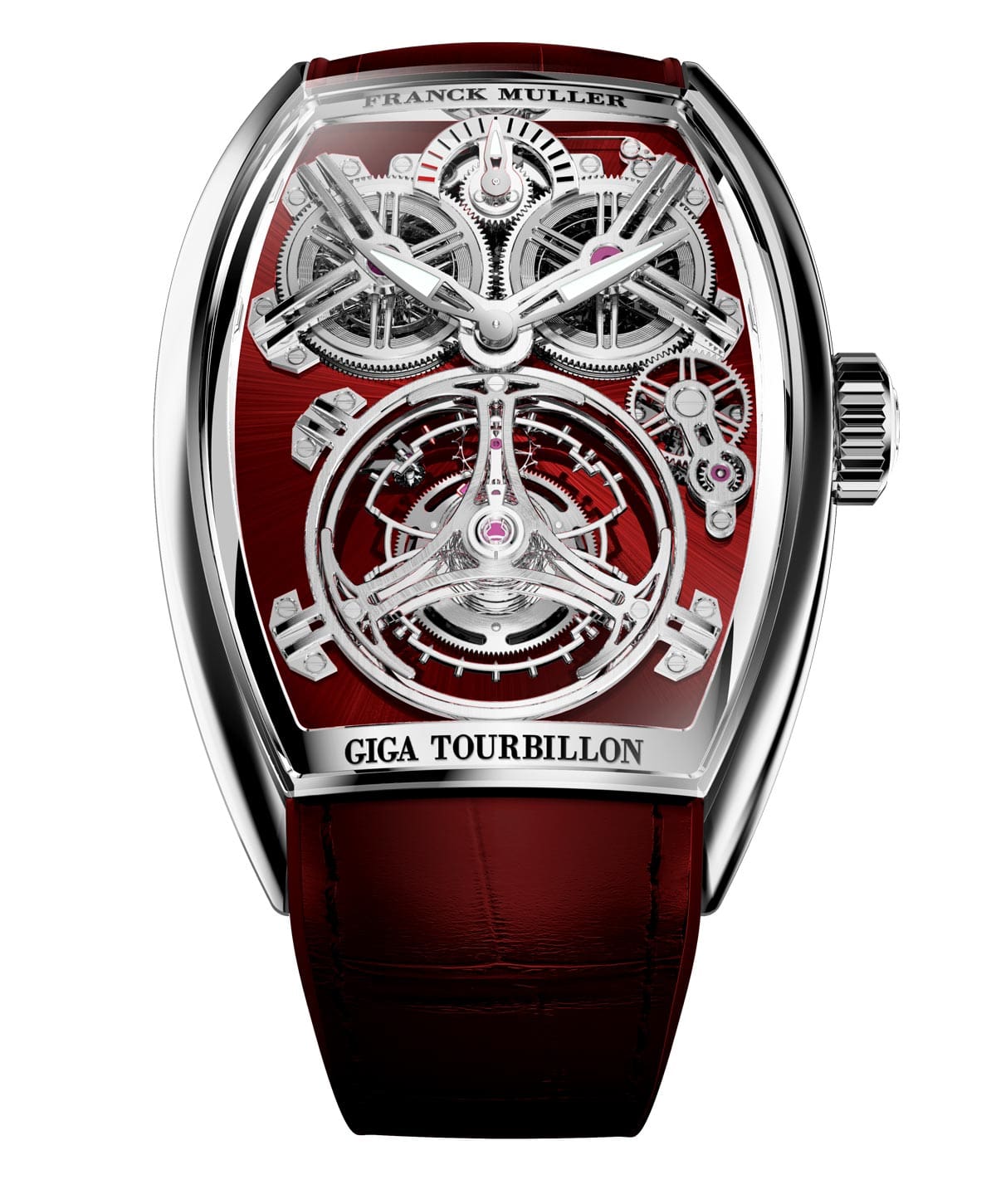 The Franck Muller Curvex CX Giga Tourbillon showcases an exquisite redesign of the iconic Giga Tourbillon, nestled within the elegant Curvex CX case. Its 20 mm Tourbillon steals the spotlight, occupying half of the skeleton dial, granting a serious sense of depth. Ingeniously engineered, the tourbillon cage employs lightweight titanium to ensure precise performance. The Curvex CX Giga Tourbillon boasts an impressive 4-day power reserve, made possible by the inclusion of four barrels. This feat is a departure from the norm, as traditional tourbillons typically rely on one or two barrels. The extended power reserve guarantees that the watch keeps ticking reliably, even during periods of rest. While the Curvex is jammed packed with technical achievement, the dial of the Curvex CX Giga Tourbillon is a work of art in its own right. The sunray brushing decoration adds a captivating radiance to the watch, with layers of lacquer further enhancing its luminosity and depth. It is a sight to behold, capturing the essence of fine craftsmanship and attention to detail.