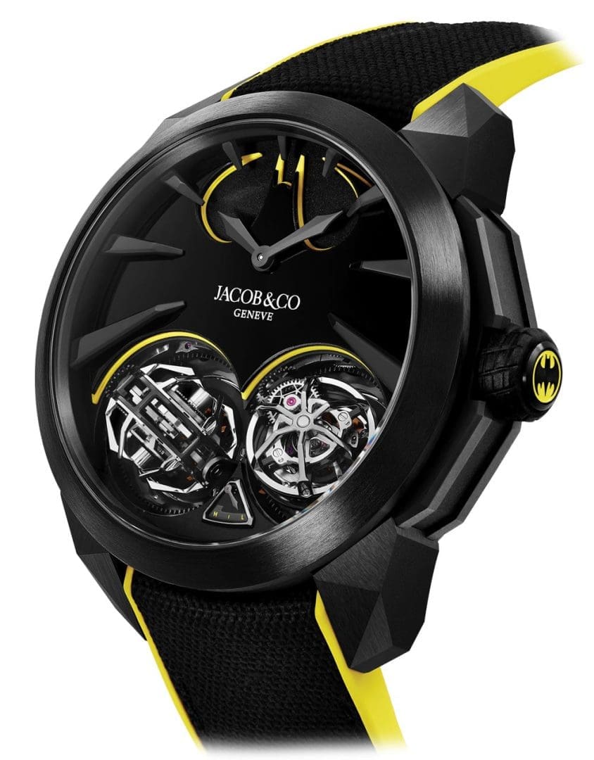 From a superpowered alliance between Jacob & Co. and DC Comics, lands the Gotham City Black DLC Titanium watch, a timepiece that captures the very essence of the enigmatic Dark Knight. With only 36 pieces in existence, the watch’s architecture pays tribute to Gotham’s vertical darkness while infusing every component with symbolic meaning. From the rubber band-adorned crown resembling the Batmobile’s tires to the Bat emblem-shaped onyx dial, illuminated by a mysterious blue glow reminiscent of the BatSignal, the Gotham City watch is a masterful fusion of horology and heroism. The flying tourbillon cages, reminiscent of grappling hooks, and the highly advanced Calibre JCFM10 with twin triple-axis tourbillons at 5 and 7 o’clock, symbolise Batman’s arsenal of gadgets. Wrapped in black DLC matte titanium, evoking Batman’s strength and resilience, and featuring a signature drawing of Batman on the case back, this watch is a testament to the Dark Knight’s enduring legacy and philosophical complexity. “The world only makes sense if you force it to.” – Bruce Wayne/Batman, The Dark Knight Returns.