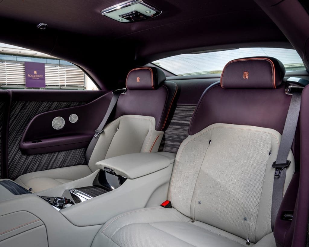 Inside, the interior is presented in Selby Grey, Purple Silk, and Sunset leathers. Sunset is also selected for seat piping, contrast stitching, and headrest monograms. Above, the Starlight Headliner features 960 fibre-optic ‘stars’ in the Sunset hue, completed with eight white ‘shooting stars’, formed with 192 fibre-optic lights. The Obsidian Ayous veneer extends to the spokes of the Purple Silk steering-wheel, which is complemented by purple instrument dials.