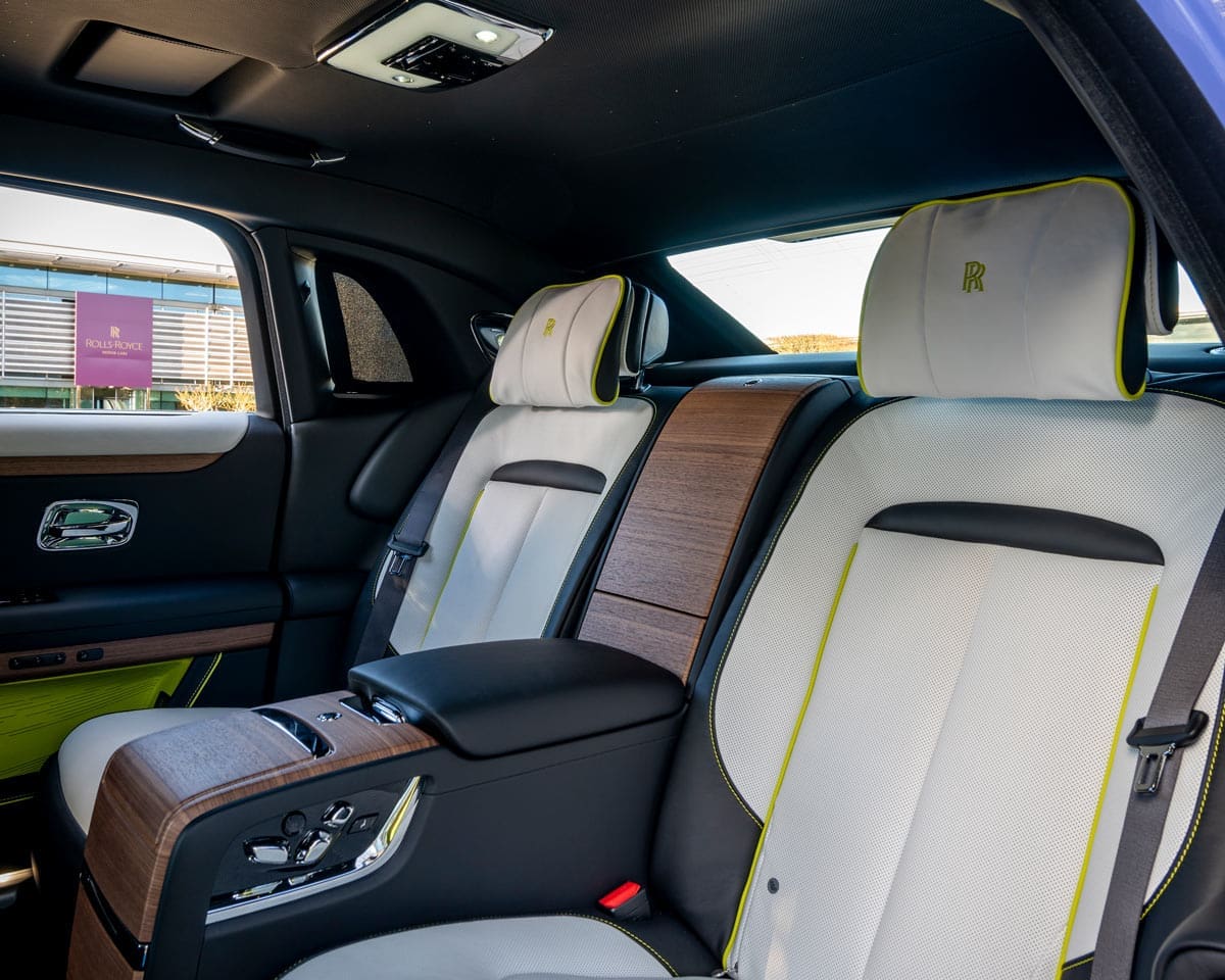 And of course, the Starlight Headliner is present and this time presented in a vivid, abstract wave pattern, like silk in the wind, mimicking the embroidered pattern on the doors. The design is created with 520 Lime Green and 520 White ‘stars’ with eight White ‘shooting stars’ that follow the curvature of the design.