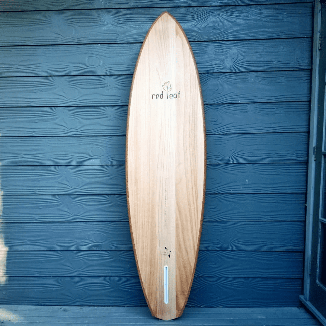 At the core of Red Leaf’s design is a hollow timber construction technique. Instead of shaping a board from a solid chunk of wood, they build an internal plywood framework, covering it with Paulownia timber, a fast-growing species that absorbs ten times more carbon dioxide than most trees. The result? A board roughly 20-25% heavier than a standard foam surfboard, but with added durability and a smooth, momentum-rich ride that many surfers swear by.