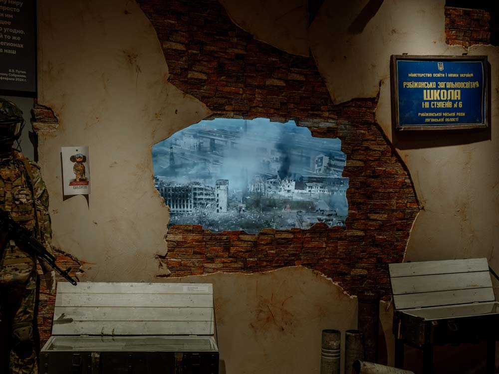 It Smells of Smoke at Home. © Aliona Kardash, DOCKS Collective, for Stern Magazine. Footage from a drone attack on a Ukrainian target is displayed alongside trophies from the front, in an exhibition at a Tomsk local history museum. Tomsk, Russia, 2 April 2024.