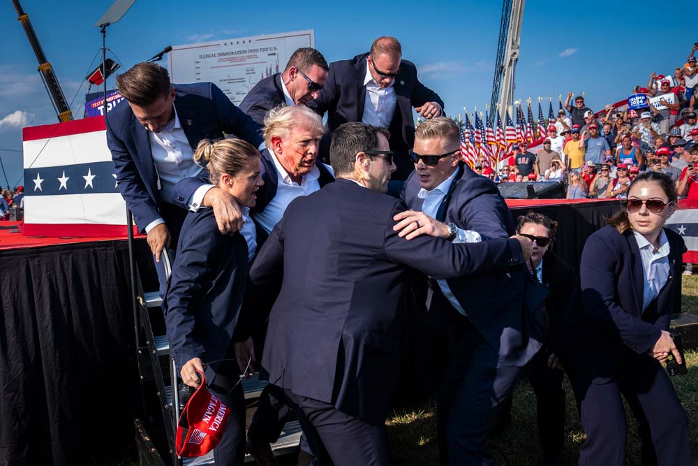 Attempted Assassination of Donald Trump. © Jabin Botsford, for The Washington Post. Butler, PA – July 13 : Members of the United States Secret Service help Republican presidential nominee former President Donald Trump off stage moments after a bullet from an attempted assassin hit his ear during a campaign rally at Butler Farm Show Inc. on Saturday, July 13, 2024 in Butler, Pa. (Photo by Jabin Botsford/The Washington Post)