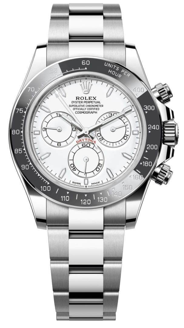 The dial is white grand feu enamel, fired at around 800 degrees Celsius, which produces a surface hardness and colour consistency that lacquer cannot replicate. The Daytona was conceived as a tool watch for racing drivers, the tachymeter scale calibrated to calculate average speed over a known distance, and the enamel dial returns it to that instrument-grade register without making a point of doing so.
