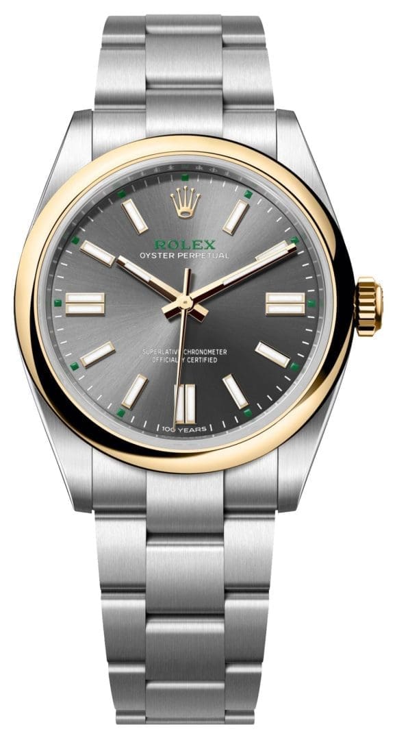 What Rolex chose to do with their centenary is, in retrospect, entirely fitting. Rather than a complicated piece or a limited edition, they made an Oyster Perpetual. Slate dial. Yellow gold bezel and crown on an Oystersteel case and bracelet, a configuration known as yellow Rolesor that has been in the catalogue since the 1930s. The archival reference is deliberate and fairly literal. Oystersteel is Rolex’s proprietary 904L alloy, which outperforms the 316L steel used by most of the industry in corrosion resistance and surface finish, though the people buying this watch are unlikely to be testing that in the field.