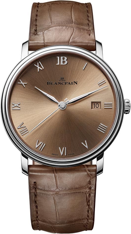 The 2025 update is, true to form, a study in restraint. The 40mm case comes in 18ct red gold or stainless steel with a slimmer bezel, reworked lugs and a thinner profile than the previous generation. The double-stepped case remains, as do the Roman numeral indexes and leaf-shaped hands, both signatures that Blancpain has correctly resisted the temptation to modernise out of existence. The “JB” symbol now replaces the traditional 12, a small but considered acknowledgement of the founding date. The new gold hands are now solid rather than hollow, with luminescent inserts, which improves both legibility and the sense of quality in hand.