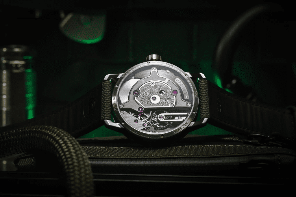 The P.03 features a black dial with Frag guilloche pattern and khaki hour markers with a matte finish and black gradient effect. The small seconds subdial is also khaki, with an azurage finish. This is packaged in a 41mm x 12.65mm case made of grade 5 titanium. These bold design elements give the P.03 a tactical, almost military appearance while still maintaining a high-end watchmaking aesthetic.