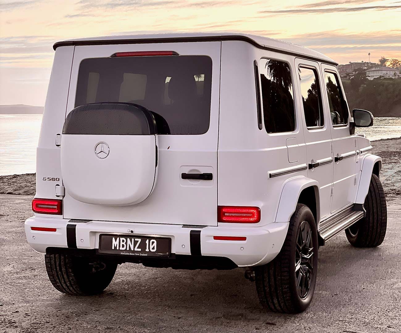 This ‘First Edition’ I’m driving is the first of the electric G series, and it’s got a couple of beautiful features, such as blue-laced carbon trim that matches around the cabin. It sports a back-door mounted spare-free ‘wheel-box’ for looks and storage. You can swap it for a wheel if you want, but if you’re not going off-road, you might keep it as is. This press vehicle sports a remarkably attractive Polar-white semi-matte exterior – officially MANUFAKTUR opalite white magno. It’s somewhere between gloss and matte, and the more tactile among us will be touching it admiringly.