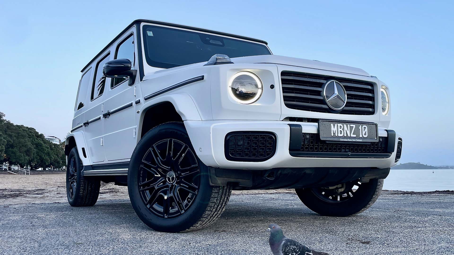 This ‘First Edition’ I’m driving is the first of the electric G series, and it’s got a couple of beautiful features, such as blue-laced carbon trim that matches around the cabin. It sports a back-door mounted spare-free ‘wheel-box’ for looks and storage. You can swap it for a wheel if you want, but if you’re not going off-road, you might keep it as is. This press vehicle sports a remarkably attractive Polar-white semi-matte exterior – officially MANUFAKTUR opalite white magno. It’s somewhere between gloss and matte, and the more tactile among us will be touching it admiringly.