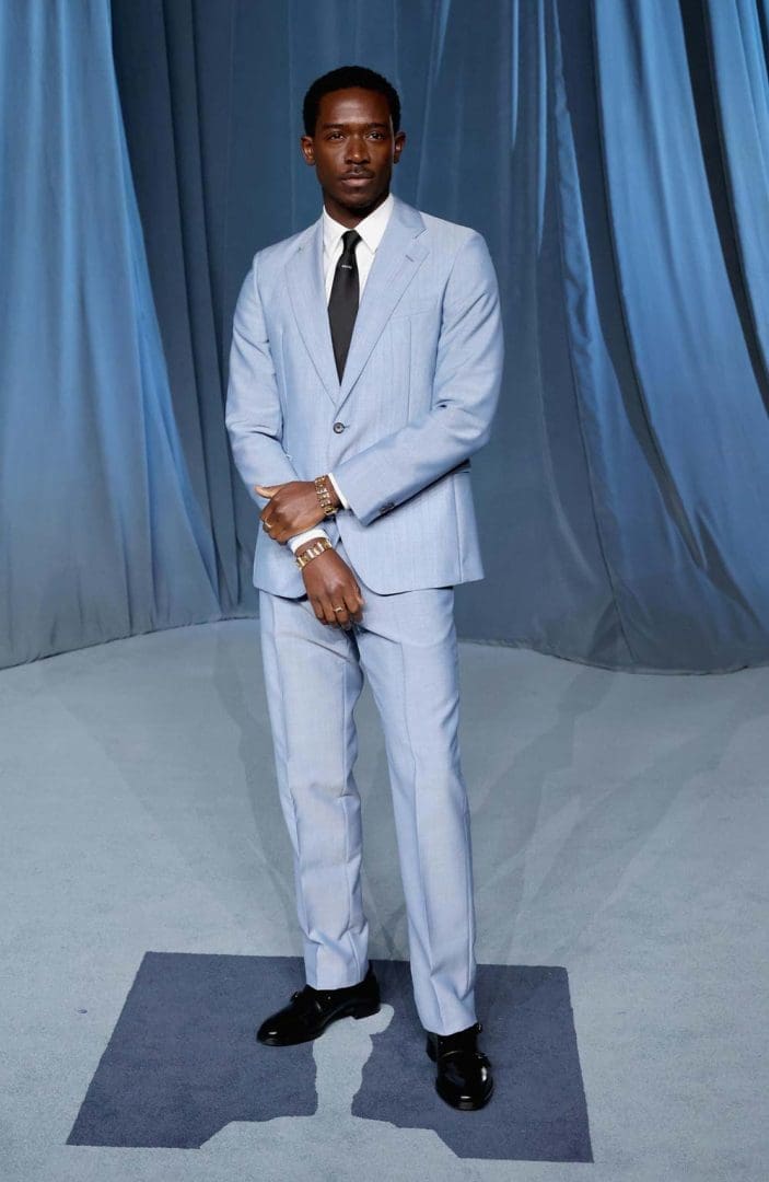 At the Fifth Annual Academy Museum Gala in October the fits were good, and a number were spotted in Prada. Our favourite goes to Damson Idris who wore a PRADA light blue mohair suit, white poplin shirt, black grosgrain tie and black leather monk strap shoes.