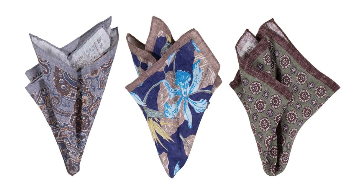 Freshly curated to elevate your summer wardrobe, this trio of Monti Castello’s latest pocket squares, showcase the natural charm of linen. Its raw structure softens tones of slate, sage and cinnamon, while fresh marine blues jostle with sandy hues across a medley of designs, from detailed paisley and mosaic medallions to fanciful florals.