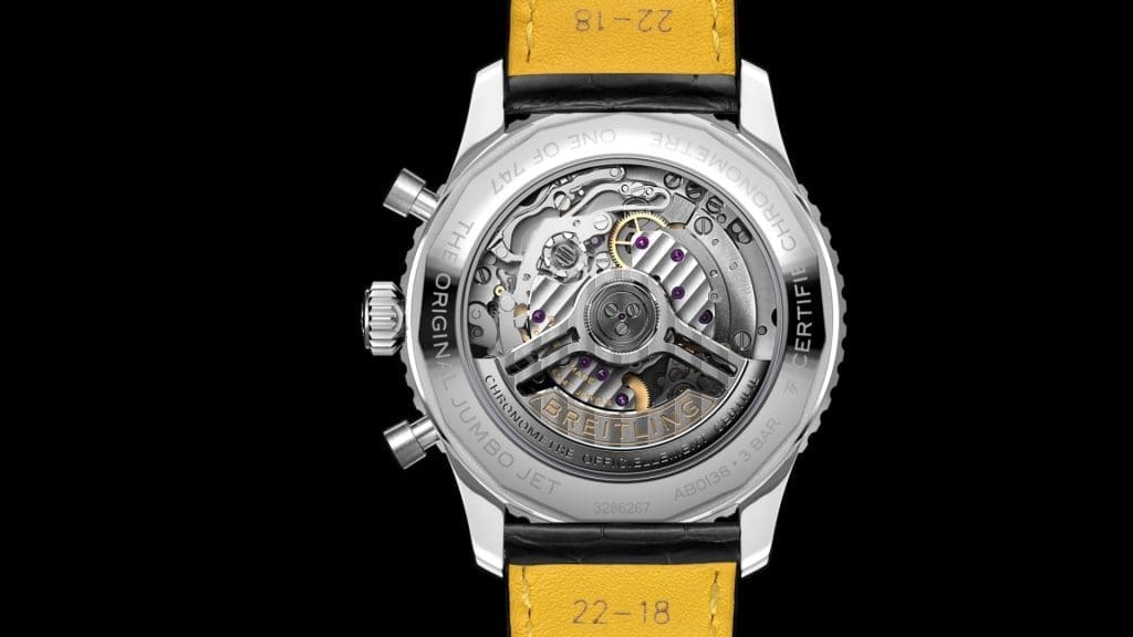 The open caseback of the Navitimer B01 Chronograph 43 Boeing 747 reveals the exceptional Breitling Manufacture Caliber 01 movement. This top-of-the-line movement offers approximately 70 hours of power reserve. The caseback is engraved with the phrase “One of 747” and “The Original Jumbo Jet,” a fitting tribute to an aircraft that changed the way we travel.