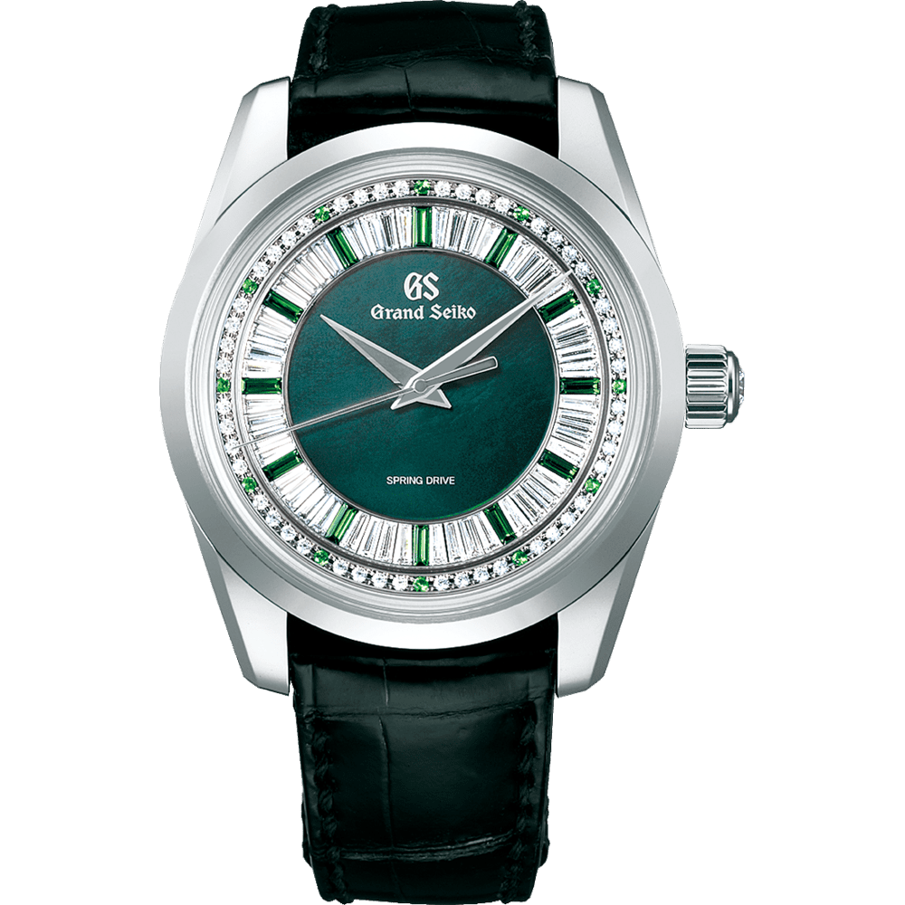 A green-coloured mother-of-pearl dial and the green garnet indexes are inspired by the tree line reflected in Lake Suwa not far from Shiojiri, Shinshu. The watch is powered by the Spring Drive 8 day Calibre 9R01 that delivers an accuracy rate of ±10 seconds per month and offers a power reserve of 192 hours when fully wound. It is set with diamonds and garnets and is protected in a platinum case.