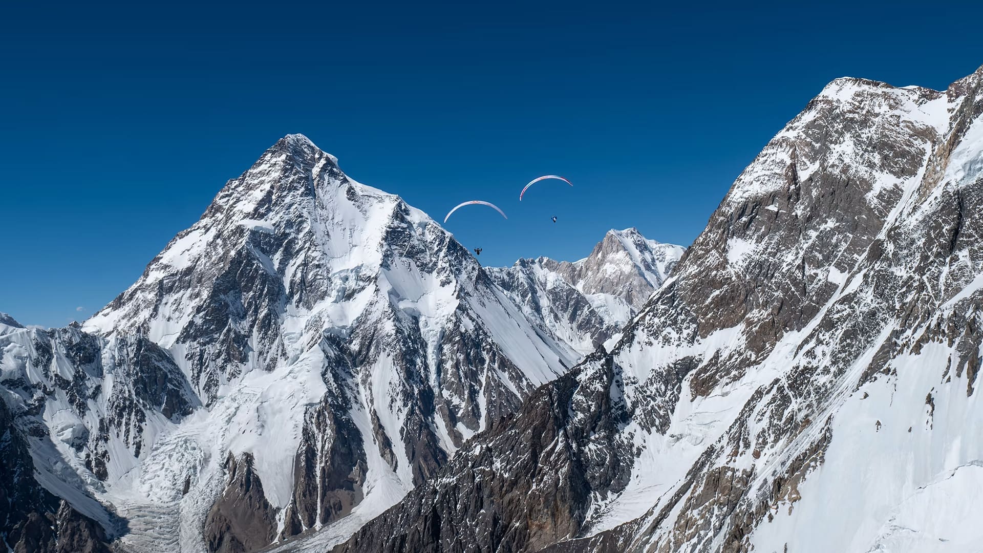 Paragliding pilots Tom de Dorlodot and Horacio Llorens fly at 6,000 metres above the Baltoro glacier in Pakistan on July 8, 2022.