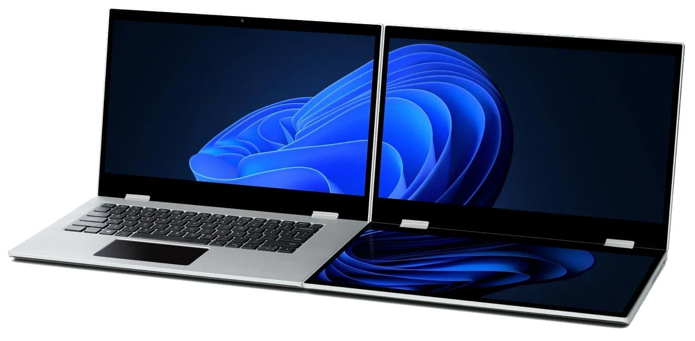 Now that we’ve had every possible iteration of screen sizes as well as some pretty novel double screen layouts it’s time to boldly venture to new frontiers. THREE MONITORS. Laptops offer a sticky design problem since people generally expect there to be a keyboard somewhere on it. XBook has designed a dual touchscreen device that folds out from a regular single screen layout. This is horrific to try and describe in text but here goes: It starts folded in half. Opening the lid reveals a keyboard and screen as you’d normally expect. But underneath is essentially a whole other laptop that flips out to sit side-by-side with a secondary monitor, and where the keyboard would normally be, a deck screen, for touchscreen stuff. All up you have three 14” screens that origami up into around 4cm thick stack in total. It weighs 3.4kg.