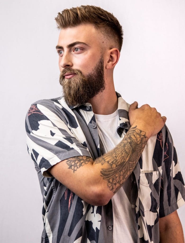 Thomas’s beard was also instrumental in pulling off this look. The top fades from the skin with it sporting longer length along the sides, giving it that sharp definition. The rest of the beard has been trimmed and squared away to give Thomas a tidy look. Beards are always great, but a domesticated one will help pull you out of the crowd from the riff raff. In sum total, this aesthetic is perfect for any bold modern man who’s willing to stand out.