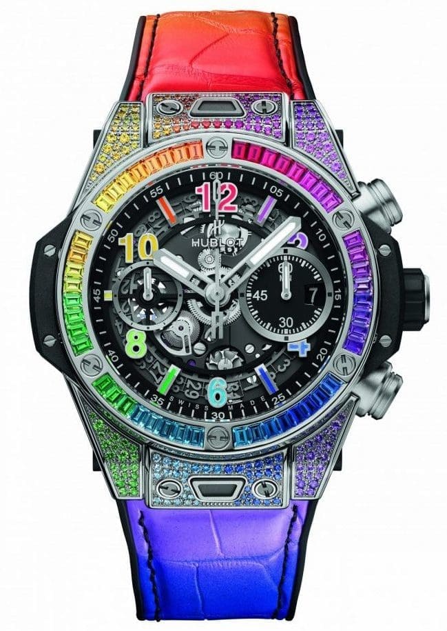 As if Hublot’s striking silhouette wasn’t enough in itself, the crown jewels have been thrown at this colourful piece of art. Well, to be more specific, it gets a mix of rubies, pink sapphires, amethysts, blue sapphires, blue topazes, tsavorites, yellow sapphires and orange sapphires. The 45mm case is set with 176 coloured gemstones while the 42mm gets 170. Even the 18k white gold bezel gets the bejewelled treatment with 48 baguette-cut coloured gemstones.