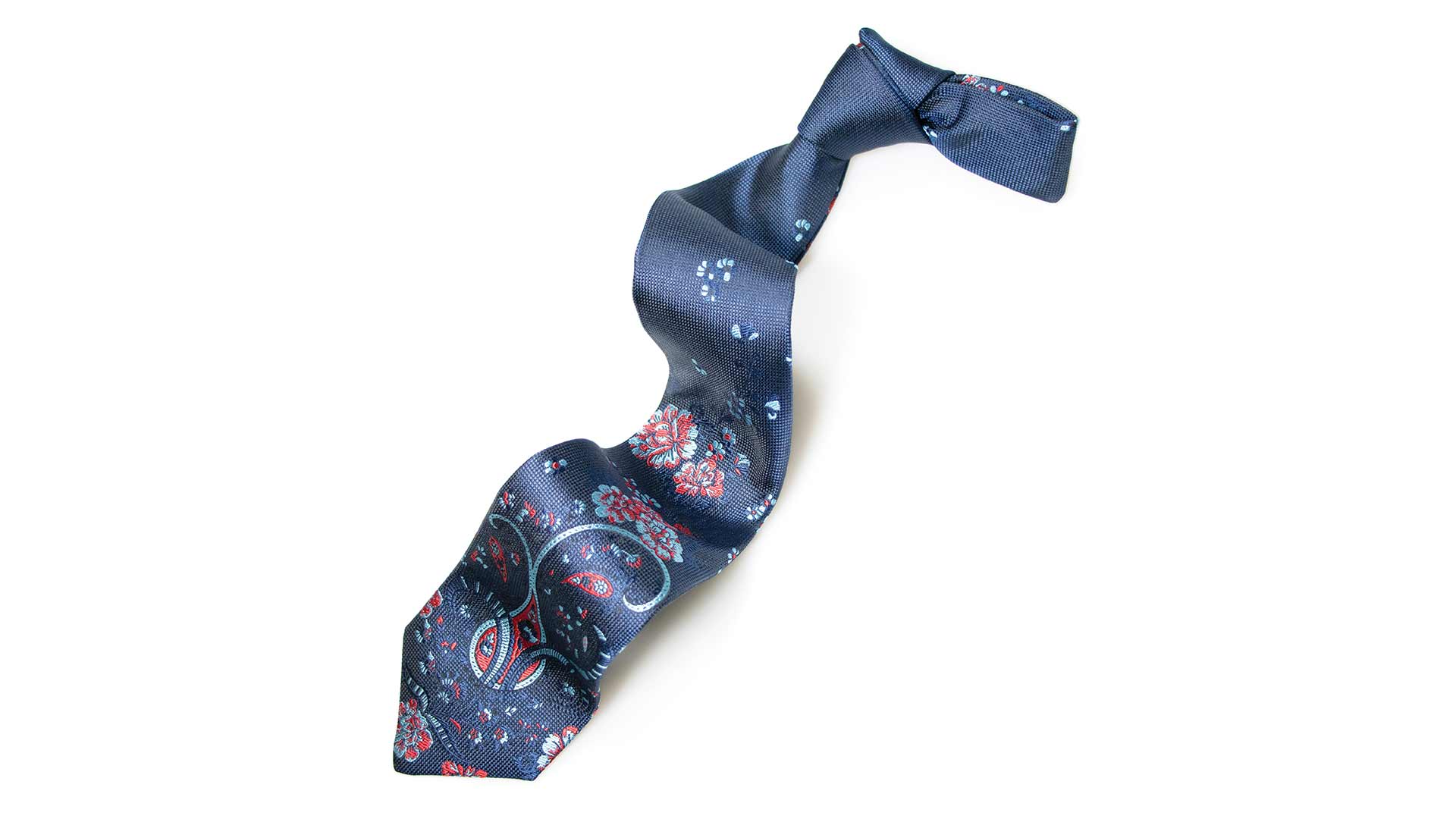 Inspired by archival ties produced in 1970s, this featured design creates a modern twist on the retrospective panelled format. Blending elements of both floral and paisley designs, the motifs float gently up the tie, fading away just below the knot.