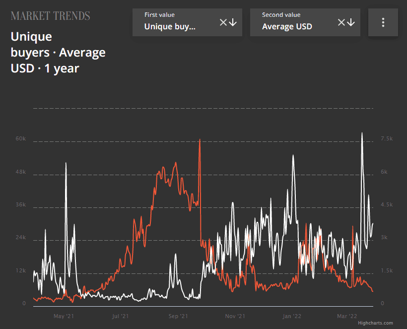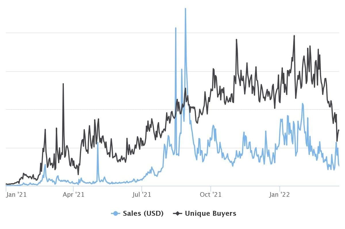 “Trading volumes are down in general, but the demand measured by the number of unique traders and sales count is increasing,” said Pedro Herrera, senior data analyst at DappRadar to Bloomberg. “So while we’re seeing less volume, there’s more activity, even though Ukraine’s conflict is definitely driving away the attention from trading.”
