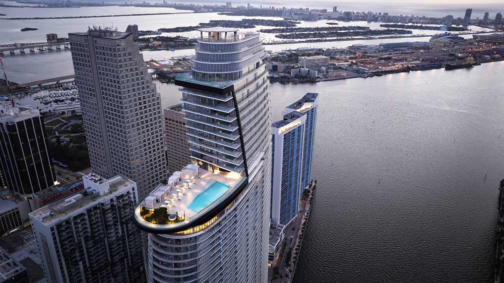 99% of these have already been sold and Aston is pleased to let us know that one in eight of the homeowners already own an Aston. the condos and amenity spaces are encased in a bold sail-shaped building reflecting the marina setting and offering gorgeous panoramic views of Biscayne Bay. Small Aston Martin flairs are diffused throughout the space including doors with bespoke artisan Aston Martin handles, number plinths, and kestrel tan leather door tabs. One small detail some would forget to account for is that the architects were mindful to create parking ramps with an incline that doesn’t scrape particularly low rides. Between the 52nd and 55th floors is a huge glass staircase. It has two movie theatres, a virtual golf simulator, business centre and conference room, kids playroom, as well as a full-service spa, beauty salon and barber shop. Why ever leave? If you need a workout just use the two floor fitness centre that looks out on views of the Atlantic. Or if you need an instagram snap of your supermodel girlfriend just head out to the infinity pool with panoramic views of Biscayne Bay.