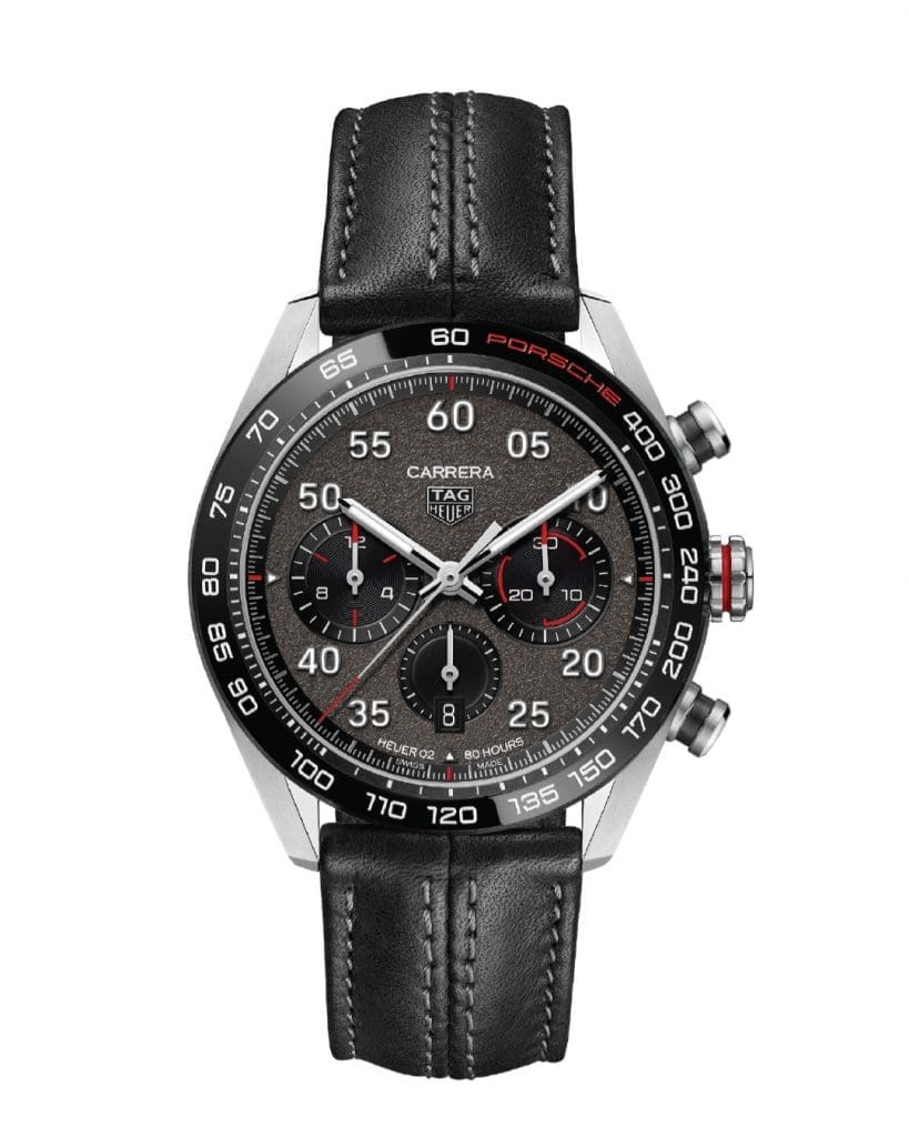 The dial features three striking black chronograph counters, one each at the 3, 6 and 9 o’clock positions, sitting on a unique grey asphalt dial. Surrounding them are the black gold plated indexes, which visually bounce off the dial thanks to a coat of Super-LumiNova®. The powerful red PORSCHE inscription stands out boldly on the fixed ceramic black tachymeter bezel. The in-house Calibre Heuer 02 Automatic can be admired at work thanks to a clear screw-down sapphire case back. Tying the exceptional piece together is a fine hand-stitched embossed black calf leather strap.