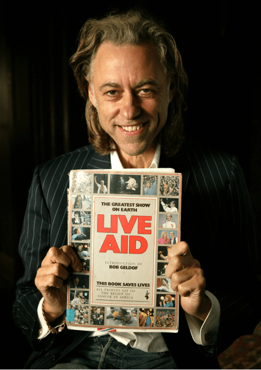 And we all know about the 1985 Live Aid, don’t we? Billed as The Global Jukebox, that colossal 16-hour superconcert—staged simultaneously in the UK and USA—featured over 75 musical acts, such as Queen, Madonna, U2, The Who, Sir Paul McCartney, Bob Dylan and Sir Elton John, to name but a few. Beamed to 150 countries around the world via 13 satellites, Live Aid was and is still one of the largest satellite link-ups and television broadcasts in history. And Geldof was the driving-force behind all of it. Band Aid and Live Aid combined raised over 150 million dollars in donations and, reportedly, up to 40 percent of the world’s population tuned in to watch it live.