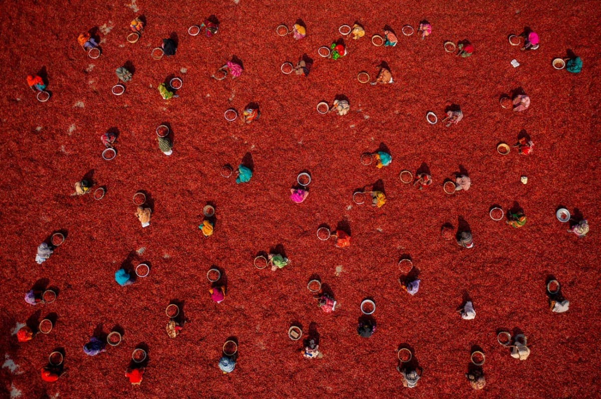 Countless chilli peppers surround labourers in the Bogura district in the north of Bangladesh.