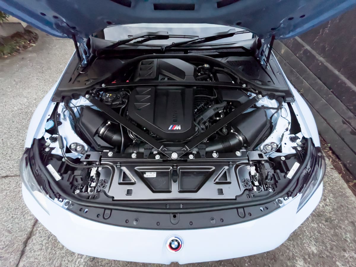Open the hood and discover 2 things. First, it’s so tightly packed in that you can’t tell what is what and that you will need a BMW engineer to fettle and tune. And second: The massive crossbar (with its sibling in the boot) is one of the reasons this chassis is so strong.