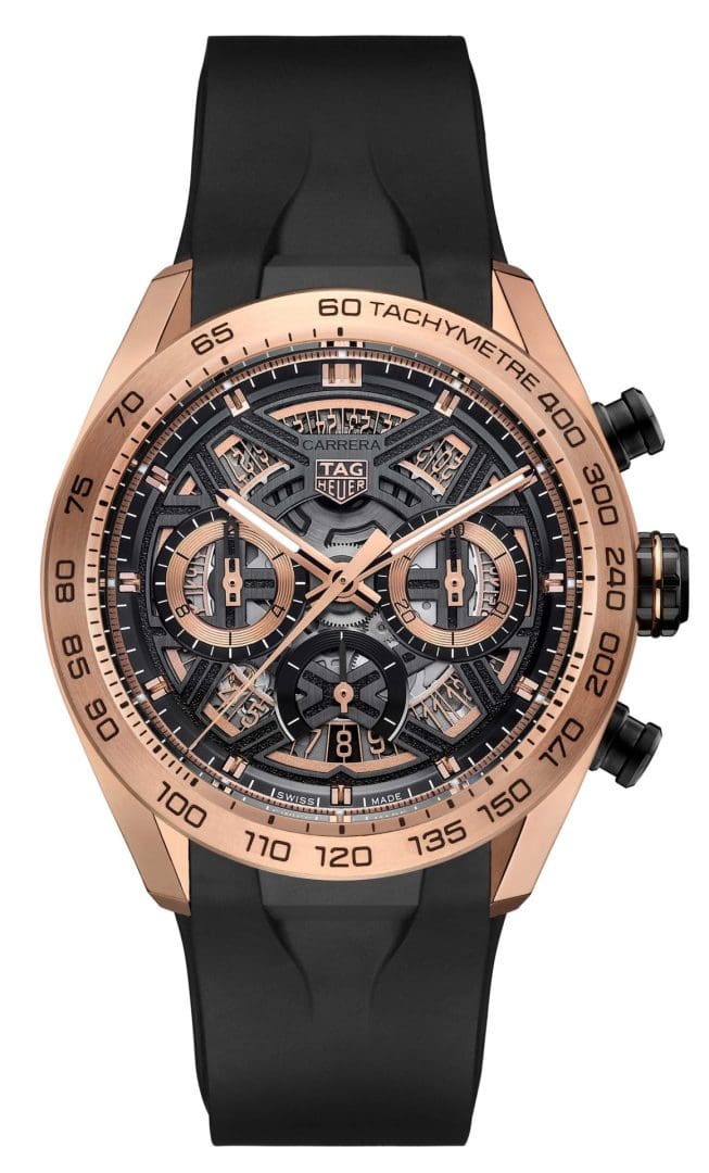 In 1963, the first TAG Heuer Carrera was introduced, a name chosen to represent adrenaline, resilience, and precision. Now in 2025 we’re getting a new evolved form represented by the TAG Heuer Carrera Extreme Sport collection comprised of the TAG Heuer Carrera Chronograph Extreme Sport Twin-Time and the TAG Heuer Carrera Chronograph Extreme Sport in solid rose gold. The TAG Heuer Carrera Chronograph Extreme Sport pictured above is crafted in solid 18-carat rose gold, both case and bezel. The gold moves its way into the interior as well with key visual elements, from the hands and sub-counters to the flange and date disc, all detailed in rose gold.