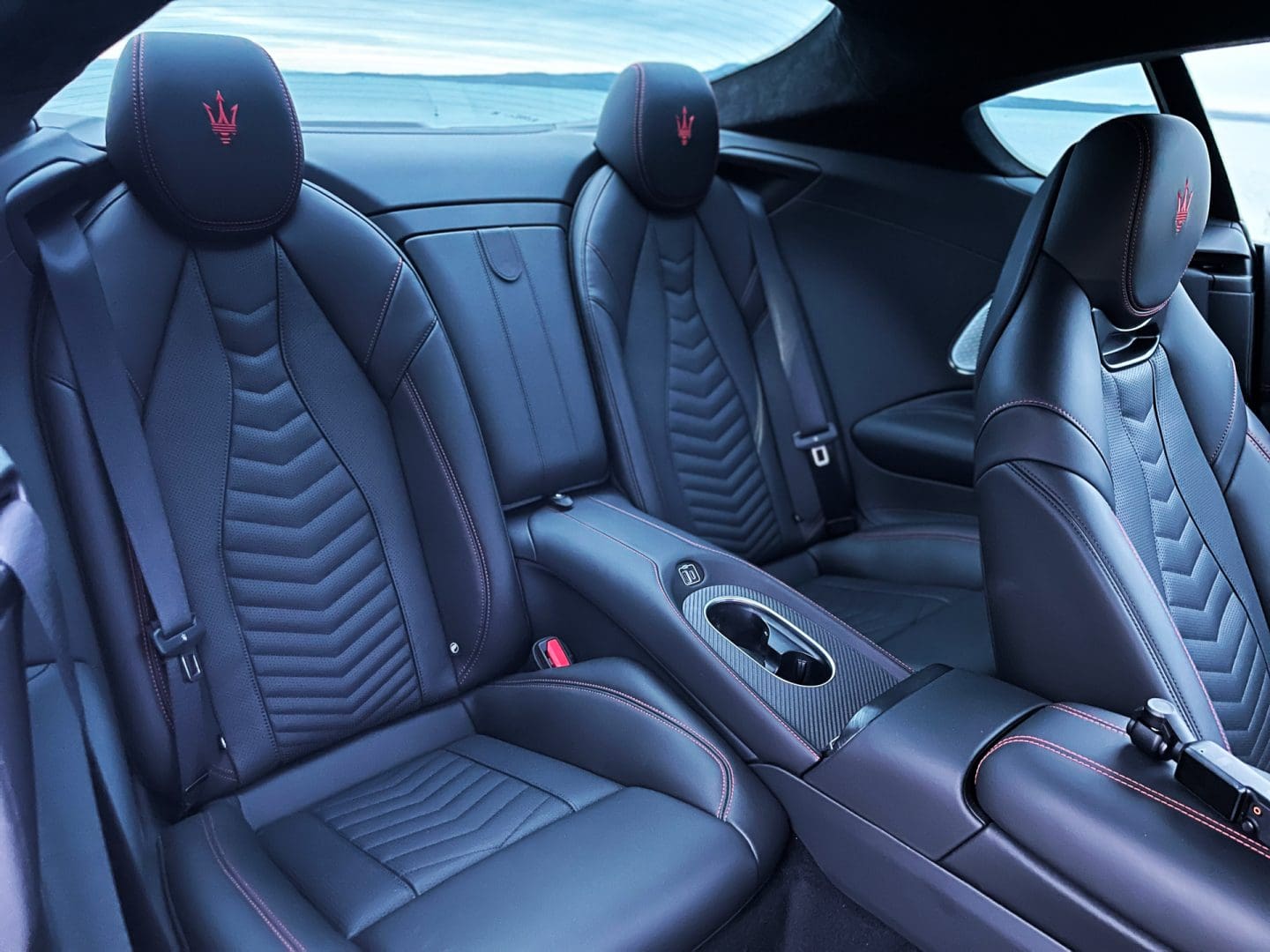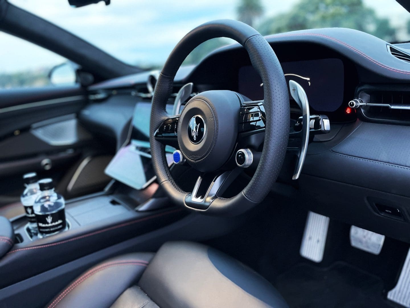 Three models are available, all AWD with the same interior trim: the GranTurismo Modena, Trofeo, and the electric Folgore. The Modena packs the 3L V6 engine, pushing out 490 HP, for 0 to 100 km/h in 3.9 seconds. Then there’s the one we drove: Trofeo, also a V6 3.0 L, amped to 550 HP, hitting 100 km/h in 3.5 seconds. And electric fans rejoice, the Folgore is on its way, boasting 761 HP, rocketing from 0 to 100 km/h in just 2.7 seconds. It’s interesting to note that the GT is a rear biased AWD, meaning that most of the time you’re driving a rear-wheel-drive sports car, and the front axle only turns on when ultimate traction is required, which it might be if you deploy all the power.
