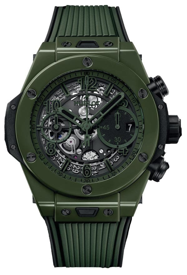 Alongside the Magic Gold Hublot are also releasing a limited run duo Big Bang Unico Orange Ceramic and Big Bang Unico Dark Green Ceramic. The orange ceramic piece is unique as hublot had to invent the material themselves but personally we’re a fan of the more outdoorsy camo-style Dark Green model. It has a classic 42mm case with a three day power reserve and water resistance up to 100m. It has a skeletonised dial and hands, hinting at the complexity inside and showing off the iconic column wheel at 6 o’clock. The strap is Black and Green Structured Lined Rubber and features the patented Hublot “One-Click” interchangeable bracelet design for quick customisation.