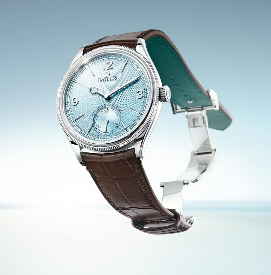 Rolex are whisking us back to a simpler time with their Perpetual 1908. Encased in gleaming 950 platinum it features an ice-blue dial that intricately weaves a guilloché rice-grain motif. Underneath this artistry is some serious craftsmanship and ingenuity in the form of the formidable calibre 7140 movement. A masterclass mechanical precision that features a high-efficiency Chronergy escapement, a shock-resistant Paraflex system, bridges decorated with Rolex Côtes de Genève and a cut-out oscillating weight. Introduced in 2023, this collection offers a fresh take on classic watchmaking styles, enriched with the distinctive craftsmanship and design legacy of Rolex. It also pays tribute to the year Hans Wilsdorf first coined and registered the ‘Rolex’ name in Switzerland, marking the inception of the brand and a fitting testament it is.