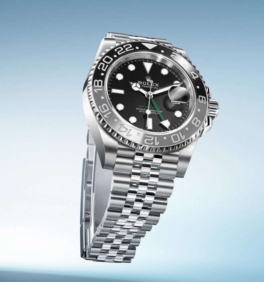 The calibre 3285 also powers the date and the separate 24-hour hand. The triangle tipped 24-hour hand is embellished in green, which is echoed by the ‘GMT-Master II’ inscription on the dial.