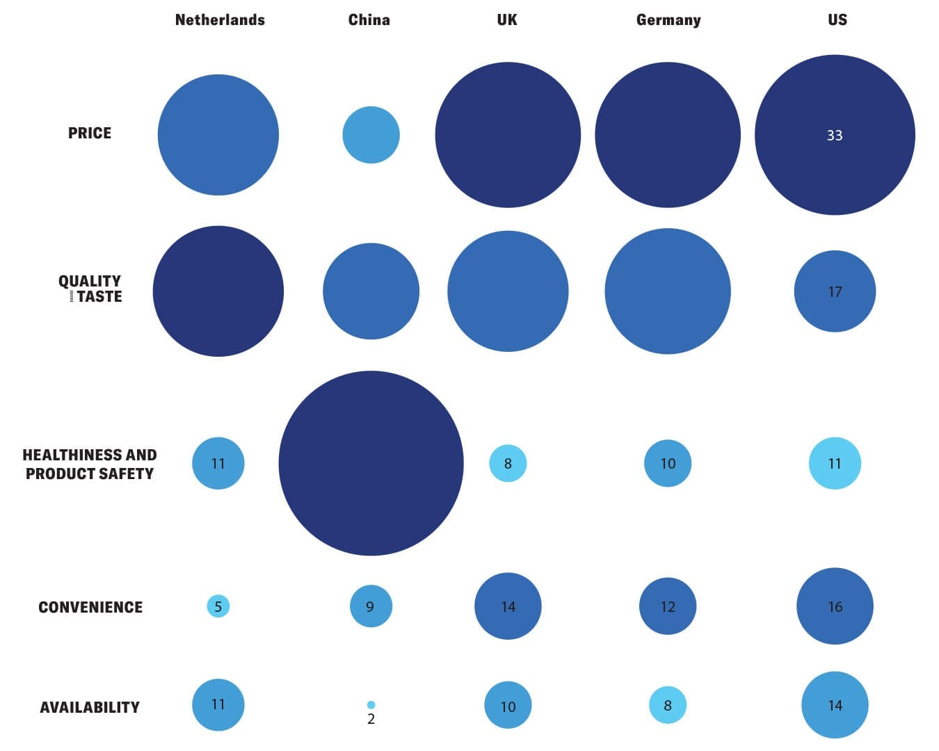 It can be easy to think that your customers are driven by price or that branded products are safe to eat, but as the chart above shows these can vary in different markets. I interpret the data to show the lower the score the more it is taken for granted.